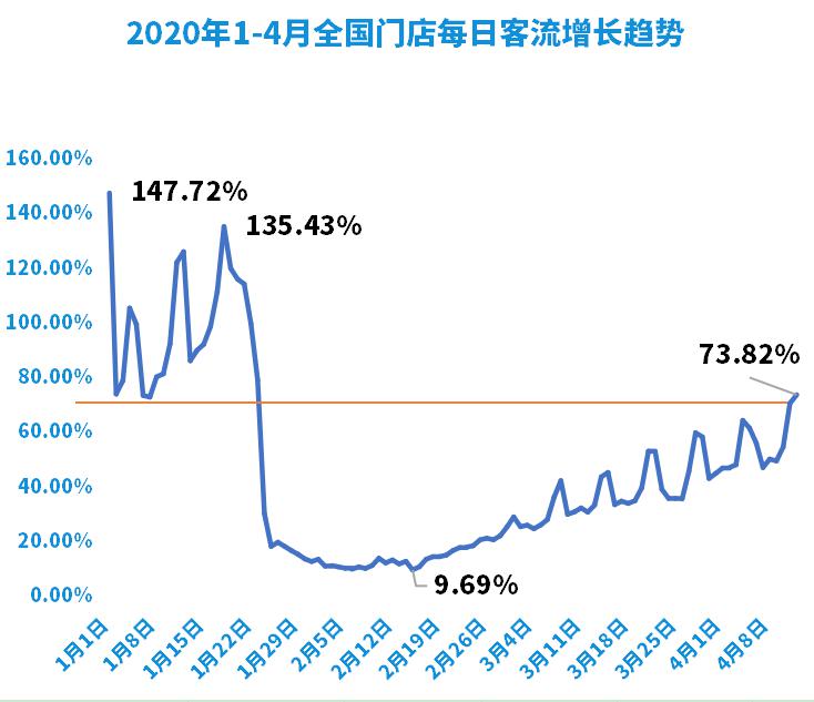 尤其值得注意的一个趋势是,从悠络客统计数据可以明显看到,到4月10、12号,全国门店每日客流量已经恢复到了往日平均水平,达到近74%,“这也说明大家还是喜欢到线下去消费的。实际上我觉得线上还只是一个辅助作用,或者在特殊时期有点价值,但是长期来说,我依然全力支持线下”,沈修平说到。